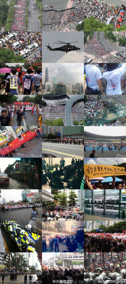 People in both Shenzhen and Guangzhou took to the streets today, along with their compatriots in Beijing, Hangzhou, Yiwu, Chengdu, Nanchang, Wenzhou, Taiyuan, Suzhou, and Changsha, to protest a Japanese landing at one of the uninhabited islands this morning.